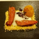 mag vielleicht das Missfallen des Puristen aus Rheine erregen, ließ aber geschmacklich neben der Süße deutlich die verarbeiteten Kürbiskerne erkennen. Große Apfelperlen steuerten ein fruchtig-frisches Aroma bei und hatten in der Pfanne gleich noch die in Solingen so belächelten „Röstaromen“ bekommen. Als weitere Komponente war mit Knoblauch, Chili, Zwiebel in Olivenöl eingelegter Feta am Start, was sich mir leider nicht erschloss. Die beigefügten feinen Kräuter hätten für ein stimmiges Gericht völlig gelangt. Nach etwas Diskussion unter den Tischgenossen baten wir nochmal um eine Probe des Schafskäses und - sieh an, sieh an - solo bzw. mit Brot schmeckte das auch fein.