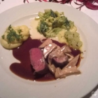 Allein schon optisch ein wahrer Genuss, erst recht während des Essens. Innen mehr rot als rosa, optimaler Gargrad, butterzart, man konnte es sich fast auf der Zunge zergehen lassen. Dazu gab es Scheibchen von Steinpilzen, die mit einem Klecks heller Sauce beträufelt waren. Das Wintergemüse, Wirsing und einige Kohlrabi-Stückchen, passte hervorragend dazu. Auch das kleine Bätzchen Perigord Trüffelpüree war für mich ein Volltreffer. Der Trüffelgeschmack war deutlich herauszuschmecken, ohne letztendlich zu überwiegen. Klasse