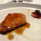 Beim folgenden Gang, dem pochierten Kalbsfilet, goss der Küchenchef am Tisch die intensiv duftende Kalbsjus neben das mürbe, von orientalischer Würzmischung ummantelte Prachtstück. Auch hier wieder ein aromatisch voll aufgeladener Teller, der jedoch keineswegs über die Stränge schlug. Schon der Klecks vom tadellos abgeschmeckten, schmelzigen Auberginenpüree war zum Reinlegen. Der arabische Klassiker „Baba Ganoush“ ließ grüßen. Zusammen mit einem erdigen Stück von der Roten Beete und einem leicht bitteren Blatt Radicchio ein eher puristisch konzipierter Fleischgang, dessen bewusste Reduktion auf klare Aromen ein äußerst wohlschmeckendes Kleinkunstwerk entstehen ließ. So geht charakterstarke Produktküche: ohne viel Schnickschnack und Gourmetgedöns punktgenau und stimmig auf den Teller gebracht. Chapeau!