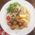 Der Steinbeißer war auf den Punkt gegart, spitzenmäßig. Die kanarischen Kartoffeln schmeckten ihr sehr lecker. Eine wohl super schmeckende rote Soße in einem kleinen extra Porzelangefäß auf dem Teller serviert rundete das Gericht ab. Meinem Schatz hat es so geschmeckt, dass ich nicht einmal eine Kostprobe abbekam.