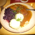 Im Detail kann ich nur über mein Essen berichten, bei dem der Rotkohl wieder recht grob geschnitten war, wenn auch deutlich nicht ganz so wie zehn Tage vorher in Leipzig erlebt. Aber auch dieser hatte die sehr gute Garzeit bekommen und hatte im Inneren noch leichten Biss. Auch die Knödel zeigten mit ihrer unregelmäßigen Struktur und ungleicher Größe deutliche Spuren von eigener Herstellung. Dabei waren sie genauso fest und auch wieder locker wie Knödel eben sein sollen.