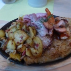 Nach gefühlten zehn Minuten wurden die Essen serviert, die Haxe auf dem Teller meines Gegenübers hatte schon enorme Ausmaße. Ich bekam einen Teller, der bis auf die Dekoration mit Tomatenvierteln und Kräutern leer war, und eine kleine ovale Pfanne mit Bratkartoffeln und Kraut, auf dem die Steaks aufgeschichtet waren. Der Speck war darum herum drapiert, die „Bratwurst“ war aber eher ein Witz. Es handelte sich um eine fingerdicke, etwa 8 cm lange Brühwurst, die an den Enden aufgeschnitten und so frittiert war. Dagegen waren die Steaks sehr gut, nicht zu klein, von guter Qualität, sehr gut gegart und äußerst schmackhaft. Auch die Bratkartoffeln waren so, wie sie sein sollten, mit Speck und Zwiebeln angerichtet und schöne Röststellen an jedem Stück, dabei nicht zu fettig. Das Sauerkraut war für meinen Geschmack eine Spur zu weich, geschmacklich aber sehr gut trotz Kümmel, den ich sonst nicht so gerne habe. Hier war es aber genau richtig.