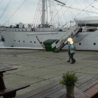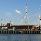 Vor der Kneipe stehen ein paar Tische und Bänke, vis-à-vis der Gorch Fock I. Der eigentliche Biergarten befindet sich aber hinter der Kneipe, mit Blick auf den Yachthafen.