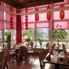 Die Einrichtung wie Pfeilerverkleidungen und Raumteiler besteht aus mittelbraunem Holz, die Stühle aus Bambus. Die Tische waren mit roten Stofftischdecken und weißen Überdecken bedeckt, darauf gab es braune Platzsets. Auf einigen Tischen stand in der Mitte eine gläserne Drehplatte, als Tischschmuck jeweils eine Tulpe in einer Porzellanvase und eine Kerze im Leuchter. Insgesamt wirkt die Einrichtung nicht so schwülstig und überladen wie in einigen anderen China-Restaurants. Aus verborgenen Lautsprechern erklang leise asiatische Musik. Was jedoch die Atmosphäre sehr störte war der Mitarbeiter, der während meines gesamten Aufenthalts seine Reinigungsarbeiten am Buffet fortsetzte und dabei deutlich vernehmbare Geräusche produzierte.