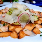Ich startete mich einem selbst gebeizten Lachs-Carpaccio (13,9€), das durch seine ungewöhnliche Wacholder-Note aus dem erwartbaren Rahmen fiel.