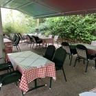 Das Restaurant liegt in einer ruhigen Wohngegend. Parkplätze sind im Umfeld ausreichend vorhanden. Die Außenterrasse ist sehr gepflegt und bietet ca. 45 Gästen Platz. Die Tische und Stühle bestehen aus einem grünen Stahlgestell. Die Tischplatten sind aus Kunststoff. Die Tisch sind mit Wachstischdecken (pflegeleicht) und weißen Stofftischdecken ein gedeckt, die mit Metallklammern gegen den Wind gesichert sind. Die Stühle sind mit grünen Nierdriglehnerauflagen ausgestattet. Die Terrasse ist mit Terrazzoplatten ausgelegt und mit dekorativen Feldsteinen umrandet. Rundrum stehen Laternen und von einer Seite wird die Terrasse durch an der Gebäudewand eingelassene Außenleuchten angestrahlt.Blumenkästen runden das schöne Ambiente ab. Das Ganze wird durch eine rustikale, voll-elektrische Markise (vier Stahlpfosten) mit olympischen Ausmaßen vor der Witterung geschützt.