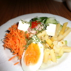 Er bestand aus geraspelten Möhren, Wachsbohnen, Zwiebelwürfel,aber auch wieder mit dem Ei und dem Schafskäse und das leckere Dressing.