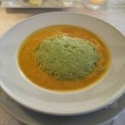Der Ingwer war gut dosiert, die Suppe schön sämig und kleine Karottenstücke mit angenehmen Biss sorgten für Abwechslung. Der Kerbelschaum hatte zwar einen schönen Stand, trug jedoch geschmacklich eher nicht zur Suppe bei: dafür fehlte es ihm leider sind Aroma. Trotzdem war es eine schmackhafte Suppe.