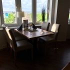 Große Tische bieten ausreichend Platz für die Speisen, auf den breiten, weiche gepolsterten Lederstühlen sitzt man sehr angenehm. Das Restaurant ist modern gehalten, mit Stilelementen aus der Schifffahrt als auch mit Fotos des alten Cuxhavens verziert. Eine angenehme, heimelnde Atmosphäre. Leider machte uns die einsetzende Dunkelheit den Blick auf die See zunichte, die vorbeiziehenden Lichter verkündeten aber das emsige Treiben auf dem Weltschifffahrtsweg nach Hamburg.