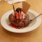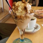 Das Tartufo war leider aus der Form, eher leicht platt, die Vertiefung mit Orangen-Likör gefüllt, mit Sahne abgedeckt, einen Amarena-Kirsche als Deko + Waffel. Hoffe ich kann demnächst (im Mai) mal ein Bild zeigen, wie es sein sollte – wenn ich im Eiscafé von ital. Freunden zu Gast bin. Geschmacklich habe ich über das Haselnuss-Eis schon alles geschrieben. Die Likör war ein schöner Kontrapunkt zum Eis, welches dankenswerter Weise nicht total und massiv in Zartbitter-Schoko-Bröckchen gewälzt worden war. Fazit: sehr lecker – optisch: na ja…das geht besser (vielleicht lag es an daran, das viel los war – sollte aber nicht sein).