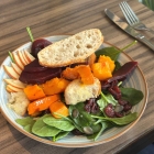 Gerösteter Kürbis, zarter Blattspinat, gebratener Tofu, Apfel & Cranberries, Balsamico-Rote Beete, Kürbiskerne, Kräuter Croutons und Yuzu-Vinaigrette.