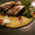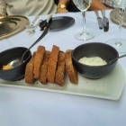 Das Amuse gueule bestand aus gratiniertem Ziegenkäse auf Pumpernickel-Crumble. Das hausgebackene Brot wurde in grau und weiß auf dem Tisch platziert mit Orangenbutter und Kräutercreme. Auf Wunsch meiner Frau gab es dazu schon einen Schluck Rotwein, bei dem wir Torre Molinas Crianza zu 36,80 (Einkauf ab 13.-) gewählt hatten.
