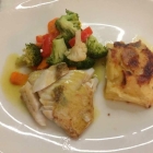 Das feste weiße Fleisch des hohen Skrei-Stückes war auf den Punkt gegart, zart und saftig und sehr aromatisch und die kräftigen Aromen des Pastinaken- Pürrees und des Spinats harmonierten sehr gut miteinander. Allerdings hätte ich mir den Spinat in einer etwas groberen Variante gewünscht, mir war er ein wenig zu "breiig". Die teils gerösteten, teils glasierten Zwiebeln mit ein bisschen Grünzeug dazwischen als Topping passte sehr gut. Rund um den Teller dieses Mal kein dunkles Balsamico-Dressing, sondern eine dickflüssige Zitronen-Creme, die mit dem Fisch gut harmonierte. Insgesamt passte alles.