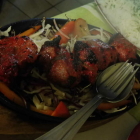Von dort aus der Küche hörte man jetzt ein sehr lautes Zischen, dann wurde eine Holzplatte mit offensichtlich sehr heißer Gußeiseneinlage an den Tisch gebracht. Darauf lagen, auf einem Bett von gehobeltem Kohl, vier recht große Stücke Lammfleisch. Das Ganze dampfte und zischte noch eine Weile, während ich mir von dem Reis auf den Teller füllte.