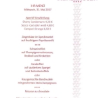 Gegen 19:00 Uhr gingen wir ins Restaurant, fanden dort nach kurzer Umschau den für uns reservierten Tisch und nahmen Platz. Einige Augenblicke später kam eine Bedienung aus dem Hintergrund an den Tisch, begrüßte uns freundlich und fragte nach unseren Getränkewünschen. Die Menüfolge des Abends war auf in die Weingläser eingedrehten Blättern gedruckt, und wir mussten uns erst orientieren. Da die dort empfohlenen Weine verhältnismäßig sportlich bepreist waren, baten wir außerdem um die Getränkekarte, die uns auch umgehend gebracht wurde.