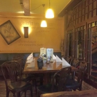 In der Tat, alle Lampen brannten, denn nur die Vorderfront hat Fenster und die Räumlichkeiten ziehen sich bis weit nach hinten. Der dunkle Eindruck wird auch durch das viele dunkle Holz an Decken und Wänden und die Tische, Stühle und Bänke unterstützt.