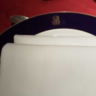 Auf dem Tisch eine schwere rote Decke über einer weißen. Darauf ein blaues Stielglas fürs Wasser und ein klares für Wein. Weiße Stoffservietten und silbernes Besteck umrahmen einen Setzteller, der mit Kobalt- und feinem Goldrand sowie güldenem Wappen aufwartet. Mit einem Wort: Grandezza!