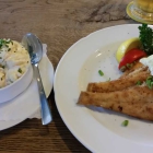 Dann hatte ich mir kross gebratenen Skantjes mit Oma Janssen`s Kartoffelsalat (13,20€) bestellt. Skantjes sollen ein in Ostfriesland beliebter Plattfisch sein, für mich war es wie Scholle. Als ich nach einer angenehmen Pause den Tischteller bekam, taten mir die Tiere erst einmal leid. So klein und jung, also so früh schon für mich gestorben, gibt es hier oben keine großen Schollen mehr? Kross gebraten waren die auch nicht, aber das war gut so, denn ansonsten wären der Fisch noch trockener gewesen. Aber es lagen ja 4 von diesen Babyfischen auf meinem Teller und das ging dann schon. Ob der Fisch frisch oder eingefroren war? Ich tippe mal auf eingefroren, möchte es aber nicht beschwören. Und für den Kartoffelsalat hätte ich Oma Janssen nicht geliebt, denn Kartoffel kochen, in Scheiben schneiden, ein paar Streifen Fleischwurst dazu und das alles mit Majo verrühren ist eigentlich kein leckeres Oma Rezept. Aber alles lag am Ende schwer im Magen.