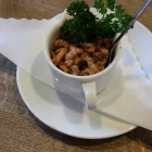 Meine geliebte Krabbensuppe durfte natürlich nicht fehlen und ich bekam diese auch schon nach wenigen Minuten auf den Tisch geknallt. Warm war diese zumindest, ein paar wenige Krabben waren auch darin und ich war froh, dass die Küche die Krabbenpaste ohne Klumpen serviert hatte. Dafür hatte diese Suppe sehr viel Salz abbekommen. Also von selbstgemacht keine Spur und für 6,50€ meiner Meinung nach zu teuer. Dazu erhielt ich ein paar Baguettescheiben mit einem Schälchen Schmalz.