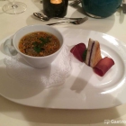 Die Küche begrüßte uns mit einem Carpaccio, serviert mit drei kleinen Nordmeergarnelen und einem mediterranem Gemüse. Die kalten Garnelen und das Lauwarme Gemüse passten für mich nicht so gut zum sehr guten Carpaccio, diese Kombination fand nicht so meine Zustimmung. Ich hoffte also auf eine Steigerung im Menü.