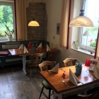 Vor der Tür ein Schild mit dem Hinweis auf durchgehende Küche. Das traf sich gut mit unserem verspätetem Lunchvorhaben. Wir hatten schon befürchtet für ein Essen zu spät dran zu sein. Frau fragte nach einem Platz für uns. Dem wurde positiv beschieden und wir betraten die nur noch spärlich besetzte Gaststube, viele Mittags-Gäste verließen das Haus gerade. Wir hatte fast freie Wahl in der Gaststube und entschieden uns für eine Tisch hier: