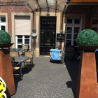 In Schöppingen kamen wir gegen 13 Uhr an, und schauten uns nach einer Gelegenheit zur Einkehr um. Wie leider häufig bei uns im Münsterland sind in der Woche Einkehrmöglichkeiten abseits von Imbissen rar gesät, sogar an diesem Brückentagfreitag, an dem alle Radwege mit Radtouristen gespickt waren. Erst am alten Rathaus erblickten wir das Akzent Hotel Tietmeyer, ich werde den Namen des Hotels hier noch ändern, dessen Terrasse und Tür geöffnet waren. Ich trat ein und fragte, ob wir zu einem Mittagessen einkehren könnten. Das wurde bejaht und wir nahmen auf der zur Straße gelegenen Terrasse unter einer Markise Platz.