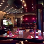 Innen beleuchtet ein LED-Sternenhimmel einen großen mit Rundbögen unterteilten Gastraum, der mit dunkelbraunem, gemütlichem Gestühl und gleichfarbigen Tischen möbliert ist. Die Tische sind geschmackvoll mit roten Tischsets, weißem Geschirr und rot-weißen Servietten eingedeckt. Eine zur Jahreszeit passende Dekoration mit herbstlichen Gestecken und einem Steingut-Kürbis mit Teelicht fehlen nicht. An den Wänden, großenteils hellbeige, aber auch purpurfarbig, schaffen dekorative alte Uhren, Anrichten und Leuchter eine heimelige Umgebung. Ein großer fahrbarer Spiegel ist mehrfarbig beschriftet, beschriftet mit den Tagesangeboten.