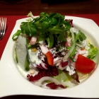 Unsere Beschäftigung mit dem Gruß aus der Küche wird dankenswerterweise dann auch unterbrochen durch die Darreichung der Beilagensalate. Verschiedene Blattsalate, Tomatenachtel, Rauke, Zwiebeln, Mais, Gurkenscheiben und Paprikastreifen sind mit einem Joghurt-Dressing übergossen. Der Salat ist vorbildlich knackig frisch, das Dressing ist schmackhaft und macht den Salat lecker.