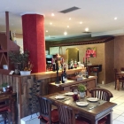 Innen herrscht mediterraner Stil vor, hellbeiger Fliesenboden, weiße Decke mit LED-Strahlern, braune Wände, braunes Holzmobiliar, eine rote Säule in der Mitte des Raums.