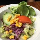 Der Salat bestand aus vielerlei Blattstücken, Gurke, Tomate und wenig Mais. Meine Frau war recht angetan davon und hat ihn auch alle verputzt.