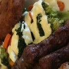Das große Stück durchwachsenen Speck hätte ich mir etwas mehr gebraten gewünscht (und ohne Knorpelstückchen). Das kleine Steak (vermutlich Schwein) war etwas zäh und trocken. Der Spieß war gut gewürzt, doch auch mit Hang zur Trockenheit. Doch eine kleine Schale mit Ajvar und die Hollandaise konnten für „Feuchtigkeit“ sorgen – oder wie weiland mein Vater sagte: „Mit etwas Senf kann man fast alles essen“.