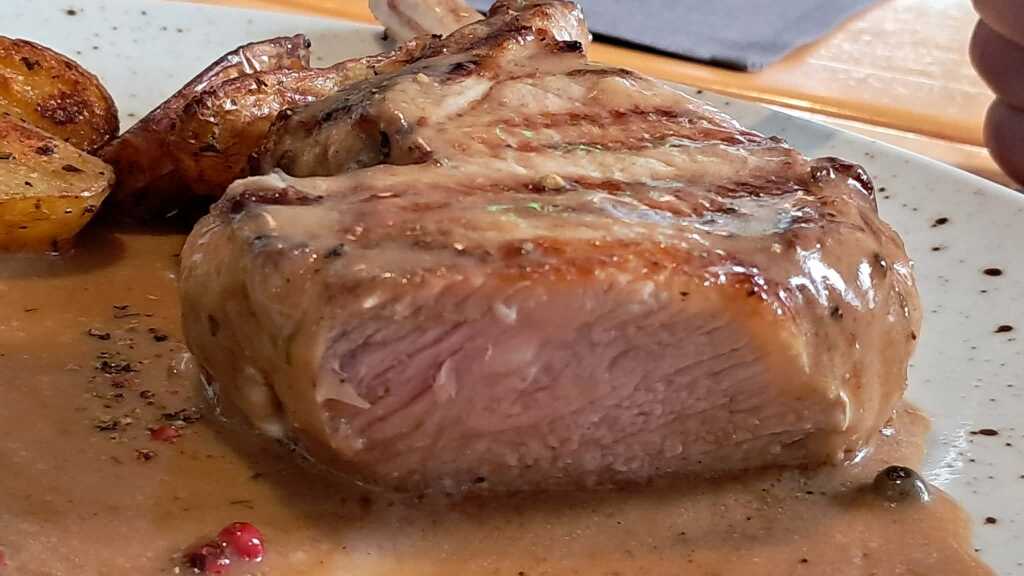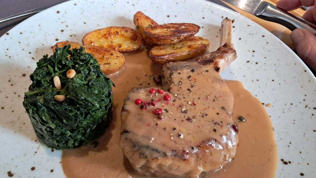 Iberico Kotelette an Rosmarin-Kartoffeln und Spinat