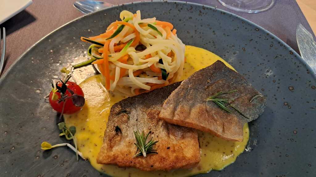 Der Fisch hatte eine knusprige Haut und war sonst zart und weich. Die sehr feinen Nudeln waren im Spaghetti-Gemüse kaum zu bemerken. Aber das Gemüse hatte feine Aromen und auch noch etwas Biss. Die Sauce rundete den Geschmack ab.