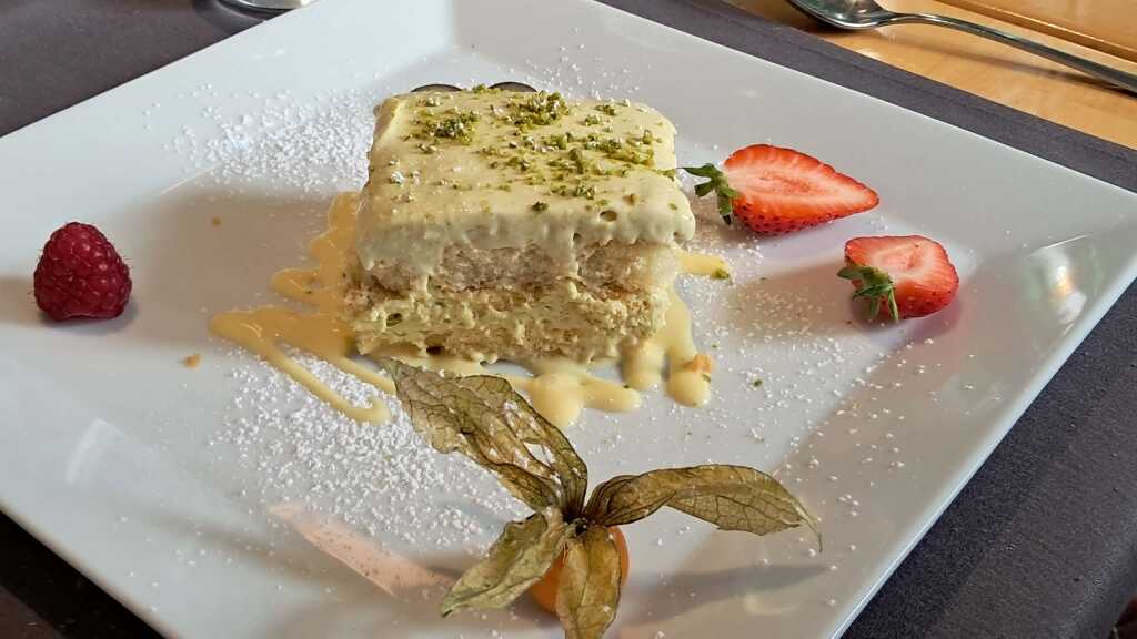 Das Tortenstück war recht hoch und hatte auch ordentliche Dimensionen im Volumen. Die Pistazien waren deutlich in der Würze zu spüren.