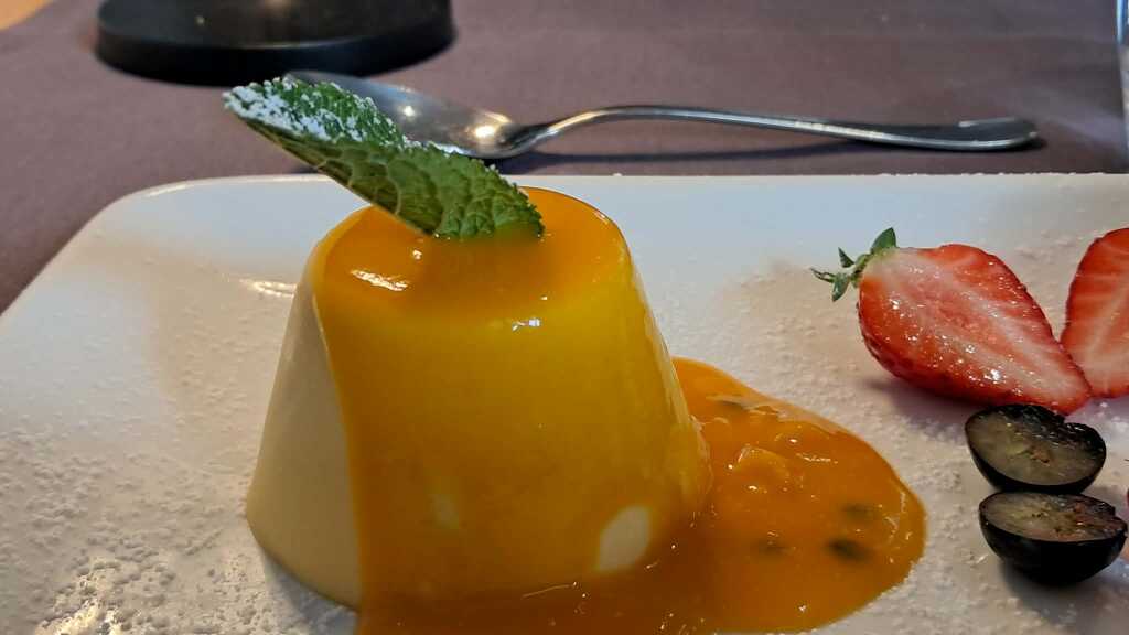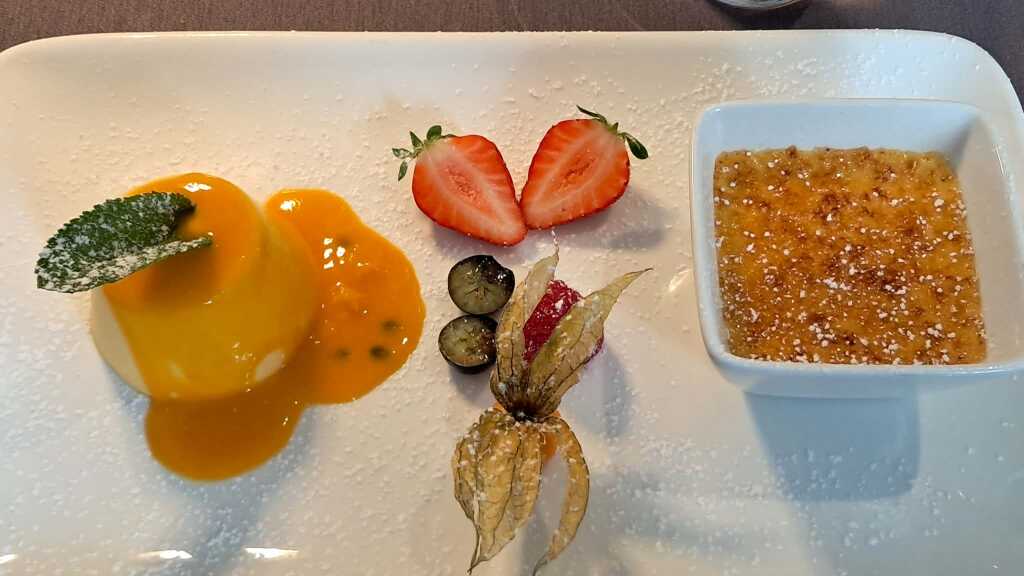Die Brulee hatte eine knusprige Oberfläche. Die Panna war cremig. Beide Varianten hatten als begleitung die Maracuja-Frucht. Das war recht angenehm zu essen.