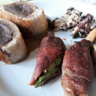Die Fleischmenge war beeindruckend groß – jeder bekam schließlich zwei „Rollen“. Mir hätte der Teigmantel etwas dünner gefallen. Das Fleisch war innen saftig und gut gegart (auch wenn es auf dem Bild vielleicht etwas „grau“ wirkt. Die Sauce hatte auch für jeden ein paar kleine Morchelstücke. Der Spargel hatte noch Biss; er war jedoch in einem relativ groben Schinkenstück eingerollt. Das überlagerte mit den kräftigen Fleischnoten etwas den zarten Spargelgeschmack. Aber man konnte die Stangen auch aus dem Mantel rollen und dann war er für uns perfekt. Das Topinambur-Gemüse war kräftig und gut abgeschmeckt und gefiel mir sehr gut, andere fanden die Aromen etwas dominant. Die kleinen Kräuterseitlinge waren nur dezent angeschwenkt und daher relativ weich, aber aromatisch.