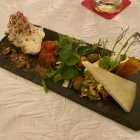Unser junger Mann vom Service bringt mir ein Käsetrio auf einer Schieferplatte, reichlich dekoriert mit verschiedenen Salaten.