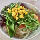 Ich stelle mir einen Salat aus Peperoni, Gurkenscheiben, Tomatenachteln, Blattsalaten, und Mais zusammen und gebe reichlich Vinaigrette-Sauce hinzu.