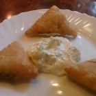 Blätterteigtaschen mit Spinat und Schafskäse gefüllt, dazu Zaziki. Etwas puristisch angerichtet, etwas grünes hätte bestimmt nicht geschadet. Aber schmecken muss es. Und das hat’s. Schwer zu sagen ob selbst gemacht. Die Füllung aber schmackhaft und gut gewürzt. Der Spinat sehr lecker, eine feine Muskatnot war zu erahnen, der Feta cremig und mild genug um den Spinat nicht die Show zu stehlen. Der Blätterteigmantel gut ausfrittiert und zu keinem Zeitpunkt fettig oder lapprig. Gut gemacht. Und erst das Zaziki. Sehr, sehr cremig, da war auch Sahne mit im Spiel, wohl dosierter Knoblauch, ein paar Gurkenraspel. Gute Pfeffernote, Zitrone und etwas Minze sorgten für die nötige Frische. Stimmige Vorspeise, so gerne wieder. 4*