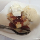 Die Teller werden wieder mit „finito?“ und der Anmerkung „ war es zu viel“ abgedeckt- und der Kollege bringt nun zwei kleine Schalen mit einer Kugel Eis, etwas Sprühsahne auf einem Stück Blechkäsekuchen mit Streusel. Es ist ein Fertigeis, Bourbonvanille, der Kuche wohl hausgemacht – ein sehr einfaches Dessert, kein Höhepunkt, aber eine nette Abrundung des Mittagsangebots.