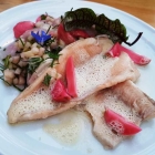 In Birkensaft pochiertes Börfinker Saiblingsfilet mit Rettich, Apfel, eingelegten Radieschen, Kräutern und Bio-Kartoffelcreme - € 22,00