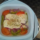 Die Wartezeit zur Vorspeise war angenehm. Der Fetakäse war eine ordentliche Portion, sah hübsch aus und duftete aromatisch lecker. Außer dem Käse waren noch rote Zwiebel, grüne milde Chilis aus dem Glas und Tomatenstückchen in der Auflaufform. Alles lecker mit Oregano und Olivenöl abgeschmeckt, ein guter Anfang.