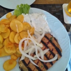 Meine Portion war ebenfalls üppig dimensioniert, aber wie befürchtet lagen keine "ordentlichen" Bratkartoffel auf dem Teller, sondern so genannte Kartoffelchips, TK-Ware für die Fritte. Hätte mich ja auch gewundert, habe auch erst gar nicht reklamiert, der Aufwand war es mir nicht wert. Geschmacklich waren sie essbar, mehr nicht. Das Bifteki war gut gewürzt und bildete mit dem innen liegenden, leicht geschmolzenem Fetakäse eine feine Geschmacksnote. Der Zaziki hat - wie schon erwähnt - ebenfalls gemundet.