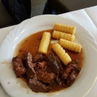 Was kann ich zum Speisenangebot sagen ? Das Vorspeisenangebot war reichlich, das Angebot an Hauptspeisen war mit insgesamt vier Gerichten recht überschaubar und die Desserts waren ziemlich fantasielos. Meine Frau fand den Rinderschmorbraten ziemlich zäh, während ihr eines der beiden Fischgerichte (nicht der Lachs) gut gefiel. Ich fand bei den Vorspeisen die gefülllten Eier und die Schinkenröllchen mit Spargelfüllung sehr schmackhaft: leider waren die mit einer säuerlichen Creme gefüllten grünen Pepperoni so hart, dass ich mir daran fast die Zähne ausgebissen habe; al dente ist ja in Ordnung, aber das war dann doch zu viel. Gut gefallen haben mir die Schneebällchen. Dazu hatte ich mir einige Tranchen vom Schweinfilet im Speckmantel aufgelegt; nicht weiter erwähnenswert war die dazu vorgesehene sehr wässrige Sauce. Dass so ein Schweinefilet, das wohl zunächst sehr gut gegart und durchaus saftig war, beim Liegen im Behälter auf dem Büffet kräftig nachzieht, lässt sich wohl nicht vermeiden; geschmeckt hat es mir trotzdem, auch wenn man es in der Küche mit der Pfefferschicht auf dem Speckmantel doch etwas zu gut gemeint hatte. Der von mir als Dessert gewählte Obstsalat kam für mich gefühlt aus dem Convenience-Eimer; die am Tisch verzehrten Profiteroles fanden durchaus Anklang. Hätte ich welche gewollt, hätte ich mich noch einmal in die lange Schlange einreihen müssen, und dazu hatte ich nun wirklich keine Lust mehr.
