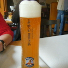 Essen und Trinken: Wie immer wurden vier Stammessen zu Preisen zwischen EUR 8,90 und EUR 12,20 angeboten. Für EUR 8,90 gab es als Stammessen 1 die "Hoorische in Pfifferlingsrahm mit Salat (Quenelles "Hoorische" , Sauce crême-girolles et salade)". Hatte ich anfänglich noch mit dem Stammessen 4, "Dreierlei Fisch in Dillsauce mit Reis und Salat (De trois sortes de poisson, Sauce aneth avec riz et épinard)" für EUR 12,80 geliebäugelt, war dies spätestens vorbei als "Eva Mattes" aus der Küche wiederkam mit der Antwort auf meine Frage: bei "Dreierlei Fisch" handelte es sich um Seelachs, Zander und Tilapia! Seelachs und Zander hätte ich ja akzeptiert aber schon bei der Erwähnung von Tilapia gingen bei mir die Jalousien runter. Ein total überbewerteter und absolut geschmacksfreier Fisch, den ich geradezu verabscheue. Infolgedessen entschieden sich beide Simbas für eines der saarländischen Nationalgerichte, die "Hoorische". Auskunft über die Stammessen 2 und 3 sowie die Stammessen der kommenden Woche geben die entsprechende Fotos im Anhang.
