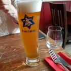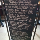 Als wir Platz genommen hatten, wurden zügig unsere Getränkewünsche erfragt; meine Frau bestellte Aperol Spritz (EUR 8,00) und ich ein Karlsberg Weizen (0,5l EUR 4,80). Ich wunderte mich, dass uns keine Speisekarten gebracht wurden; das Rätsel wurde gelöst, als eine weibliche Servicekraft (zwei Damen und ein Herr sind hier im Einsatz) einen Ständer neben unseren Tisch stellte. In einem Gestell befindet sich eine drehbare Tafel; auf der einen Tafelseite sind Vorspeisen und kleine Gerichte aufgeführt, auf der anderen die Hauptgerichte. Insgesamt ein sehr überschaubares Angebot, was allerdings auf frische Zubereitung der Speisen hindeuten kann. Die einzige Karte, die es hier im Hause gibt, ist die Weinkarte. Na gut; wir waren jedenfalls nicht unbeeindruckt. Meine Herzallerliebste mochte keine Vorspeise sondern nur ein Hauptgericht; sie wählte "Wiener Schnitzel mit Kartoffel-Gurken-Salat" für EUR 23,80. Ich hatte etwas mehr Appetit und wählte aus der Sektion "Kleine Speisen" die abgespeckte Version von "Fromage aus Frankreich mit Barosso-Baguette und Birnensenf" für EUR 8,50; dafür bekam ich drei verschiedene Käsesorten, die Vollversion mit 5 Käsesorten hätte EUR 14,50 gekostet. Als Hauptgericht nahm ich die "Linguine aglio e olio mit Garnelen" (EUR 17,00).