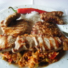 Während der sogenannte Service unter aller Sau war, ware wir mit dem Essen eigentlich recht zufrieden. Meiner Frau schmeckte sowohl mein Beilagensalat wie auch ihr saarländisches Duo gut; schade nur, dass der Rindfleischsalat einige knorpelige Streifen aufwies; ein gewissenhafter Koch sortiert solche Stücke aus anstatt sie dem Gast auf den Teller zu legen. Mein Djuvecreis hätte auch in einem guten kroatischen Restaurant eine bella figura gemacht, dagegen war der Ajvar etwas schwach auf der Brust. Was die lange alarmrote Schote am Tellerrand mehr als wett machte; schon beim Kauen schaltete sie einen sehr kräftigen Nachbrenner ein, der ziemlich lange anhielt. Der Schweinefleischspieß, war gut gegart, ebenso der Hackklops und das "Schwenekotelett", das allerdings ein Stück Schweinerückensteak war. Lediglich die drei Cevapcici hatten etwas zu lange auf dem Grill gelegen; saftig waren sie jedenfalls nicht mehr.
