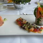 Hervorragend auch das Hummer-Potpourri; sehr schöne Hummerstücke aus Schwanz und Schere, garniert mit aus Honig- und Wassermelonern herausgestanzten kleinen Kügelchen und einem kleinen eingetopften "Sauerampferwäldchen mit Blüte". Das Töpfchen bestand aus sehr feinem Lardo und die Blumenerde darin waren kleine sehr aromatisch angemachte dunkle Mini-Linsen. Auf der anderen Seite wurde der Hummer eingerahmt von einer kleinen aufrecht stehendenLachsrolle, die mit einer sehr wohlschmeckenden weisslichen Farce gefüllt war. Eine Komponente der Füllung dürfte die in der Speisekarte aufgeführte Buttermilch gewesen sein. Wir haben diesbezüglich nicht weiter nachgefragt sondern still vor uns hin genossen. Für den Hummer beide bzw. alle vier Daumen hoch!