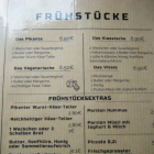 Für Madame gab es es ihr Standardfrühstück "Das Pikante" mit 2 Weckchen, 2 Portionen Butter und dem "pikanten Wurst-Käseteller" für EUR 6,90, dazu einen Milchkaffee (EUR 3,50) und ein gekochtes Landei (EUR 1,20) sowie im späteren Verlauf eine kleine Flasche Fanta für EUR 2,20. Leider hatte ich erst am Tisch auf der Karte gelesen, dass hier beispielsweise auch eine "Hausgemachte Frikadelle mit Weckchen und Senf" zu bekommen wäre. Mit EUR 4,20 wäre ich dabeigewesen; zu spät gesehen. So wurden es für den König der Savanne bzw. der Tiere wie schon beim letzten Besuch die "Zwei Landeier gerührt, mit Schinken" (EUR 4,20), dazu ein Weckchen und ein Laugencroissant (je EUR 1,20) sowie "ein gekochtes Landei" für ebenfalls EUR 1,20. Nicht zu vergessen die "Tasse Kaffee" für EUR 2,40.