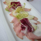 Ambiente: Der Wintergarten, beim letzten Besuch (im Winter) noch geschlossen, hat wieder geöffnet, doch meine Allerliebste wollte lieber vorne gegenüber vom Tresen sitzen. Gesagt,getan; zum einen hatten wir den Blick aus dem Fenster auf die Strasse des 13.Januar 35 und die Schrödersche Fleischfabrik ("Schröder, der Herr der (Lyoner)-Ringel"), zum anderen den auf den hinter dem Tresen befindlichen Reifeschrank mit allerlei fleischlichen Köstlichkeiten darin. In einem meiner früheren Berichte muss es ein Schrank-Foto geben; Veganer/innen mögen den Blick darauf obszön nennen, mich bringt er innerlich zum Sabbern. Für das Ambiente: Vier Sterne.